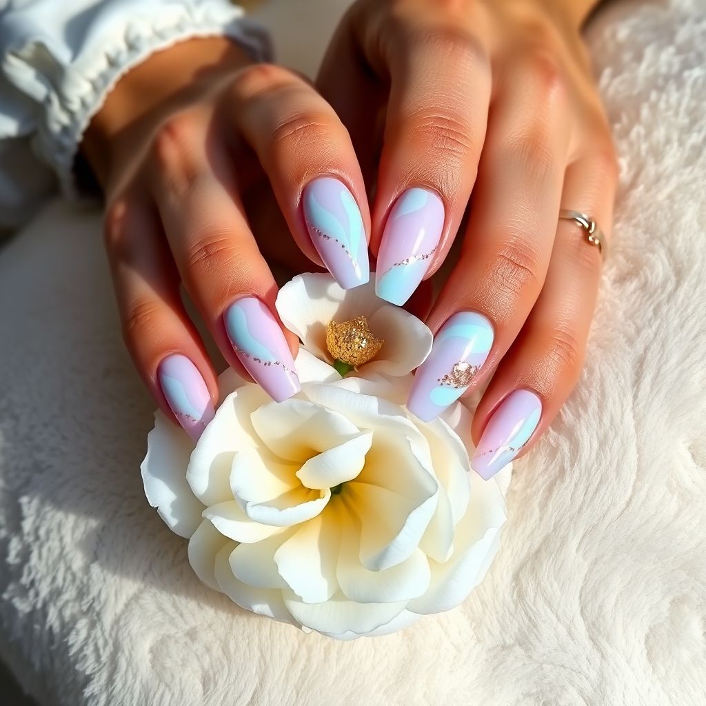 Elevate your manicure game with the dreamy Pastel Opal Glow design. This iridescent look blends soft lavender, mint, and blush tones with holographic flakes and rose gold foil for a luxurious, high-fashion finish. Perfect for spring and summer, it adds a touch of ethereal elegance to any outfit.